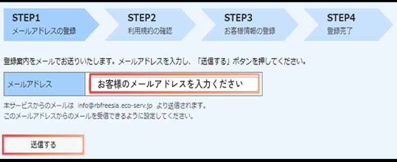 お客様のメールアドレスを登録し、送信するをクリックしてください。