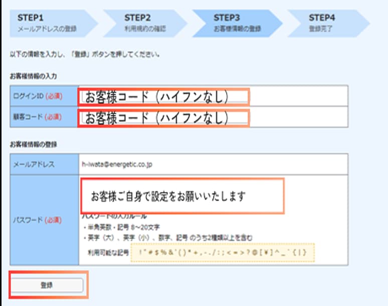ログインIDと顧客コードを入力し、パスワードを設定後、登録をクリックしてください。