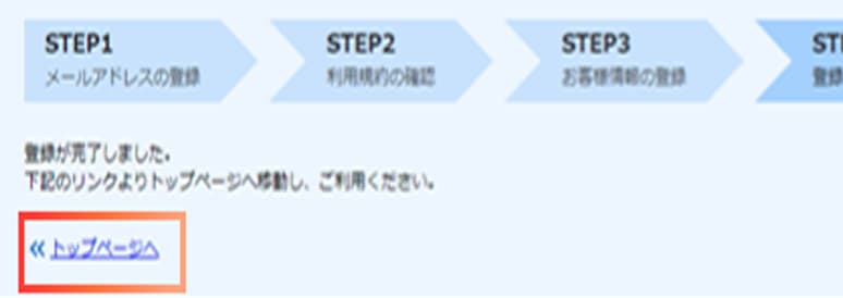 登録が完了いたしましたら下記の画面になります。「トップページへ」を押してください。