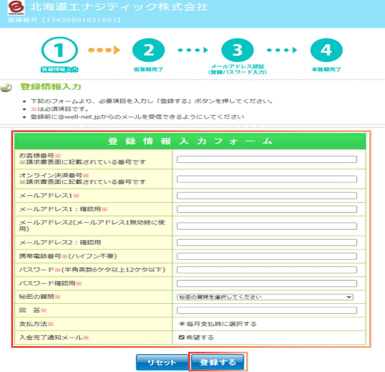 登録入力フォームへ必須項目を入力し、登録するをクリックする